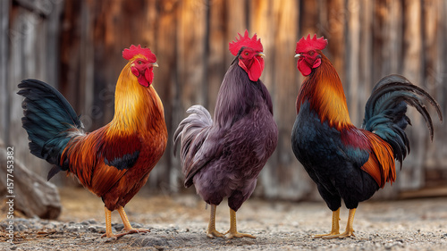 © bephoto, Fototapeta premium 雄鶏が農舎前で並ぶ誇らしげな写真