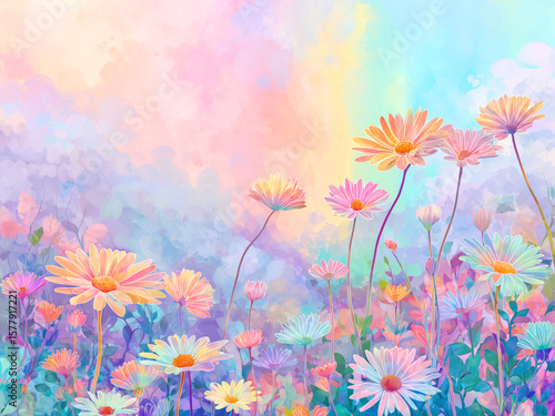 Obraz premium パステルカラーに咲き誇る花々 - 夢見るような幻想的な花畑