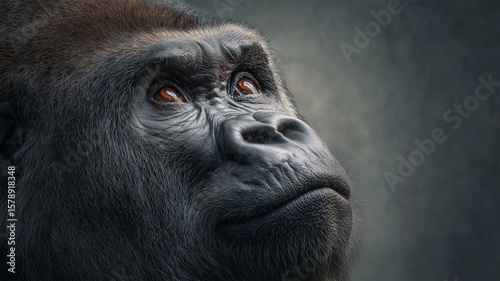 Obraz premium ゴリラが見上げる迫力の顔のクローズアップ写真