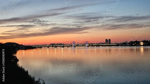 Obraz premium 양화대교를 중심으로 서울 한강에 비친 붉은 노을과 도시의 불빛