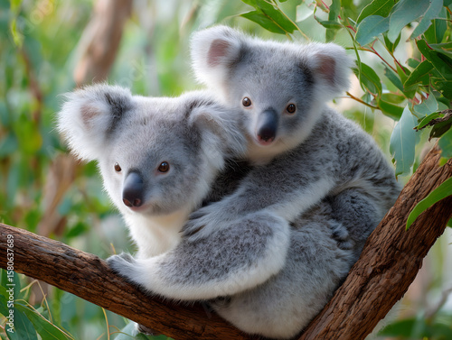 © Jumpei, Fototapeta premium 木の枝で寄り添う愛らしいコアラの親子の姿