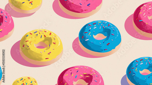 © Flower images, Fototapeta premium カラフルなフロスティングが施されたドーナツが明るい背景に整列。キッズ向けや楽しいデザインに適したポップなビジュアル。