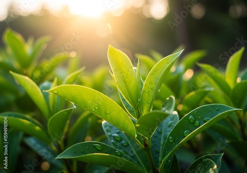 © NguyenBa, Fototapeta premium 朝陽輝く緑葉 瑞々しい露 生命力満ちる
