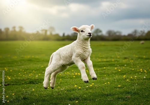 © NguyenBa, Fototapeta premium 春の陽光浴びて小羊跳躍 緑草原