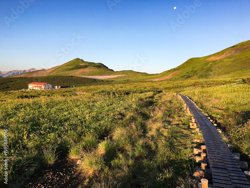 Naklejka premium 夏の五色ヶ原 夕日に照らされる平ノ小屋 〜富山県 飛騨山脈〜
