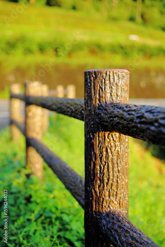 © take, Fototapeta premium 岐阜県池田町の朝日に照らされるフェンス