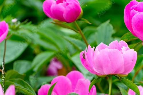 Fototapeta premium 鮮やかなピンクの芍薬の花と虫の共演