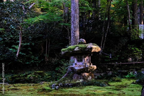 Naklejka premium 日本、京都、紅葉、寺院、三千院、鳥居、木造建築、古代建築、日本文化、歷史名勝、古都京都の文化財、木、綠色、青空、秋、絶景、写真素材