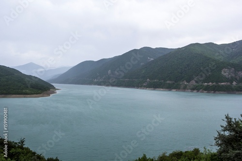 Fototapeta premium Живописное озеро в горах, водоем в горном ущелье между зеленых холмов, пасмурная погода, отдых на природе