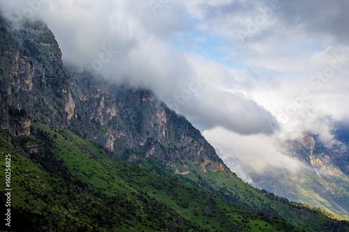 Naklejka premium Горный пейзаж, красивый вид на живописное ущелье в облаках, пасмурная погода,...
