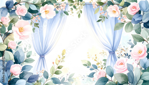 Obraz premium 水彩画風の美しい花々とブルーのカーテンが織りなす上品で優雅なウェディング装飾のフレーム