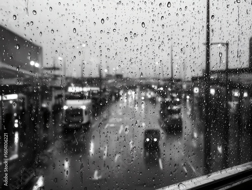 Obraz premium 雨粒越しに見える都市の夕暮れ