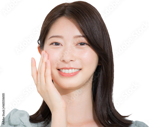 Fototapeta premium 笑顔で喜ぶ若い女性 美容やビューティーイメージのクローズアップ お肌モチモチカメラ目線の背景透明