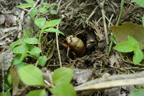 © PICCOLOGEOGRAPHIC, Fototapeta premium 日中、地面から姿を現したミンミンゼミの幼虫