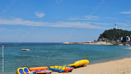 © 근영 장, Fototapeta premium 강원도 속초 해수욕장 등대와 보트가 있는 해변 풍경