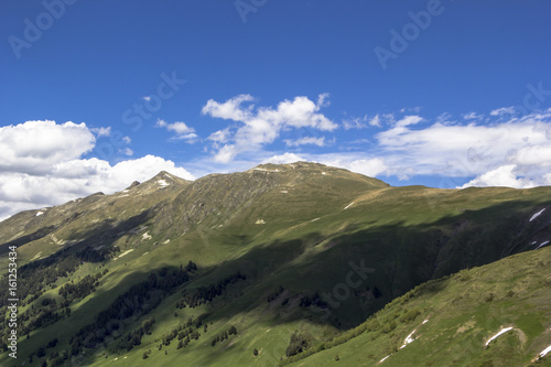 Obraz premium Горный пейзаж, красивый вид на живописные горные склоны, панорама горного ущелья, белые облака на небе, дикая природа и горы Северного Кавказа