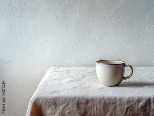 © Adrien, Obraz premium 미니멀한 테이블 위 도자기 머그잔과 고요한 공간