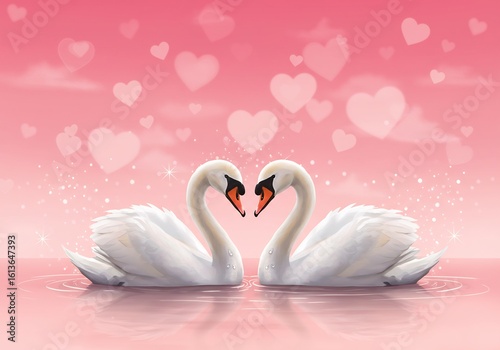 Fototapeta premium ピンクの背景に二羽の白鳥が優しく寄り添うロマンチックなイラスト