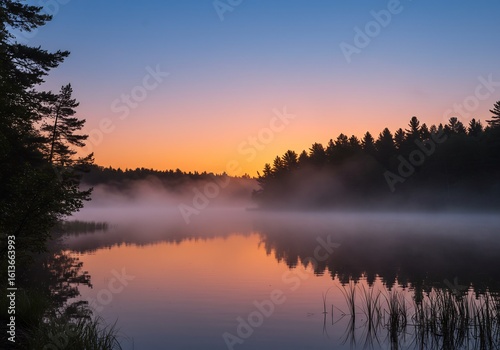 Obraz premium 静寂な湖面に映る幻想的な日の出風景