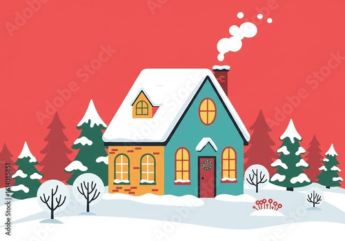 Fototapeta premium 雪化粧の可愛らしい家、煙突から温かい煙が優しく立ち上る冬の情景。