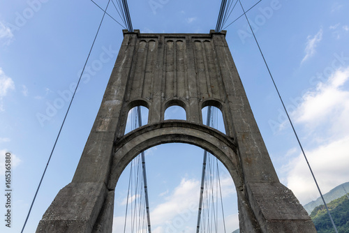 © Jazz Hapi Yuko, Fototapeta premium 歴史的な木造吊り橋と山の風景が美しい長野県の桃介橋