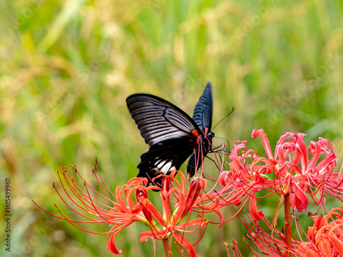 Fototapeta premium あぜ道に咲く彼岸花と黒アゲハ