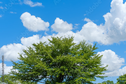 © Kazutaka, Fototapeta premium 青空に映える緑豊かな桜の木