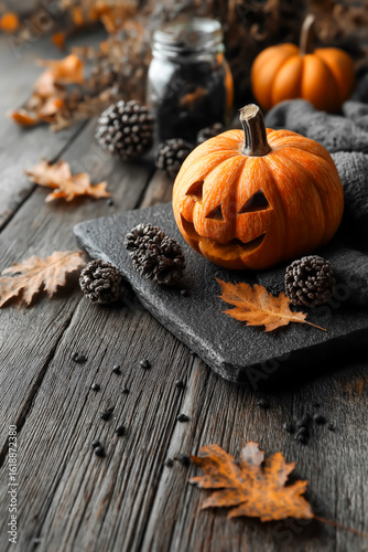 Fototapeta premium ダークウォールに映えるパンプキンライト ─ 広告バナー向け