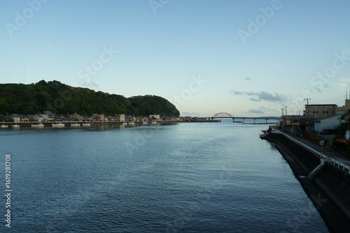 Obraz premium 大きな川に架かる鉄橋と漁村