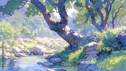 Fototapeta premium 懐かしさを感じる優しい光と緑に包まれた森の中、手描きの質感と淡い色彩が印象的な自然の風景イラスト。癒しやリラクゼーション素材としても最適な構図。