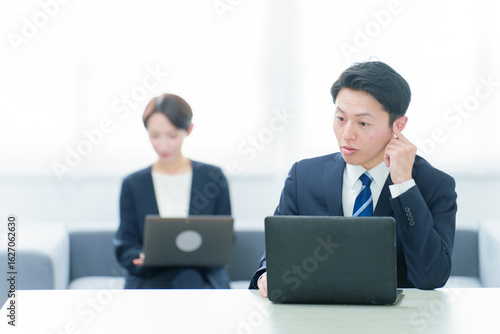 Fototapeta premium フリーアドレスでデスクワークをするビジネスパーソン