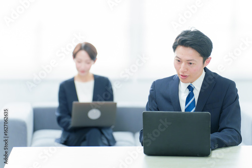 Fototapeta premium フリーアドレスでデスクワークをするビジネスパーソン