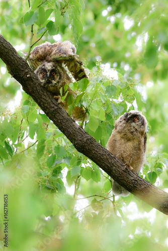 Fototapeta premium 初夏の高原で見られる愛嬌のあるかわいらしい野鳥、フクロウの仲間のトラフズクのひな