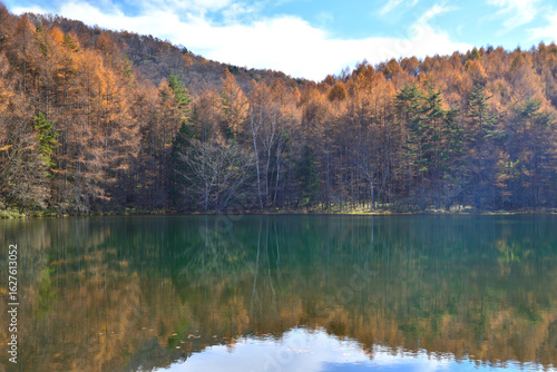 © eiji32, Fototapeta premium 錦秋の御射鹿池 水鏡に映る紅葉