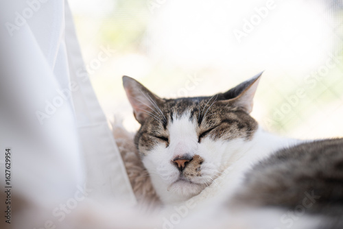 Obraz premium 窓辺でくつろぐ可愛い猫 キジトラ白