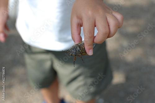 Fototapeta premium 子どもが蝉を捕まえて、手でつかんでこちらに見せている