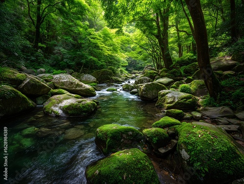 Obraz premium 苔の岩と清流が彩る夏の森林風景