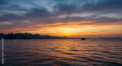 © NguyenHaiPhuong, Obraz premium 夕焼け空に染まる静かな海と山々の絶景が広がる風景写真