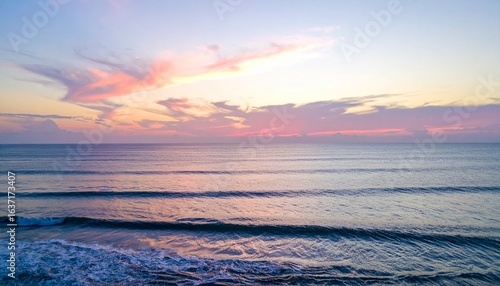 Obraz premium 穏やかな波が寄せる海岸で、柔らかなパステルカラーの空が広がる夕暮れの美しいコースタルサンセットの情景