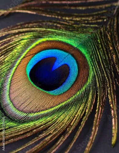 Naklejka premium 黒い背景に、孔雀の羽を一本だけマクロ撮影したクローズアップ