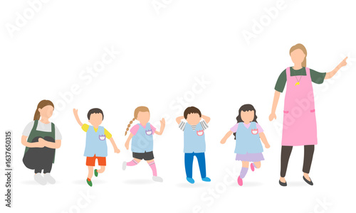 Obraz premium カラフルな幼稚園児と保育士のイラストセット