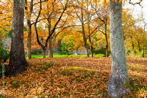 Obraz premium 秋の紅葉と落ち葉に包まれた里山風景