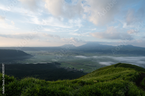 Obraz premium 大観峰から眺める北外輪山と阿蘇五岳の山並みと阿蘇谷