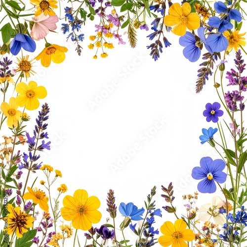 Obraz premium 黄色、青、紫の花が彩るカラフルな野花の四角いフレーム