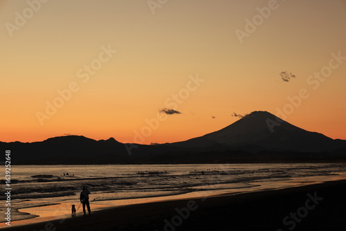 © acchity, Obraz premium 穏やかな波が打ち寄せる海岸、夕陽が染める鵠沼海岸 夕景