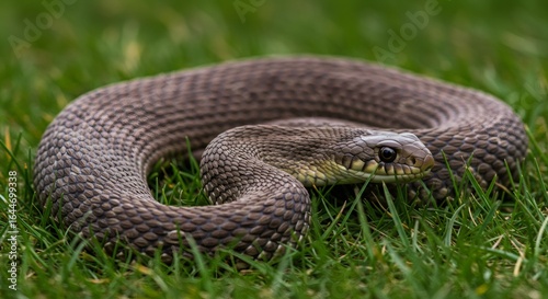 © pRxXa, Obraz premium 緑の芝生の上にコイル状の茶色と灰色の蛇のクローズアップ焦点写真