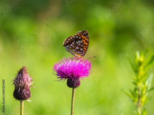Obraz premium ノアザミの蜜を吸うウラギンヒョウモン:夏の美ヶ原高原の生命の輝き