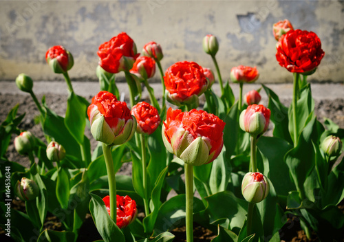 Fototapeta premium Ярко-красные махровые тюльпаны на клумбе.