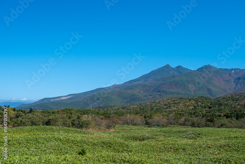 © wata _Japan, Fototapeta premium 秋晴れの山と緑の草原