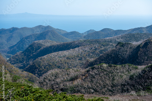 Obraz premium 枯れ木が広がる山並みと遠くに望む海